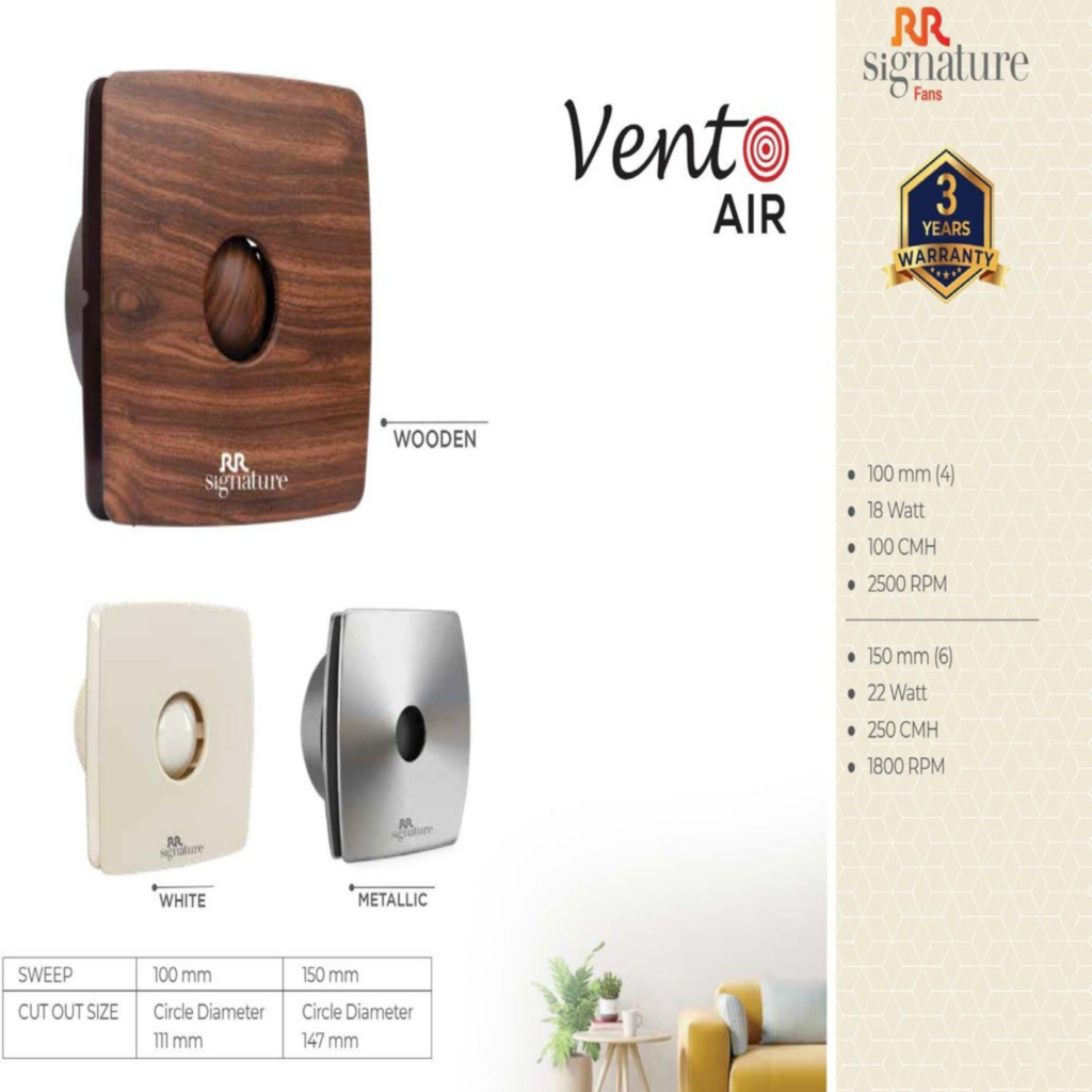 When you need an exhaust fan with classy aesthetics and compact design for spaces such as AC cabins or conference rooms, Vento Air is an excellent choice with its premium finish and superb performance. The silence and the comfort will not let you leave! SWEEP 100 mm 150 mm CUT OUT SIZE Circle Diameter 11 mm Circle Diameter 147 mm Sweep(mm) Watt CMH RPM MRP 100 (4) 18 100 2500 1290 150 (6) 22 250 1800 1340