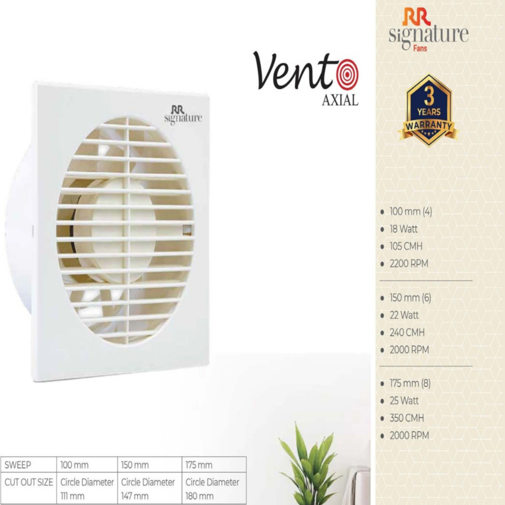 With its dynamic aesthetics, compact design and easy to install features, Vento Axial is a clear choice when you need a Hi-Performance exhaust fan for spaces like AC cabin or a conference room with the extra comforts of serene silence. With an RPM of 2200 RPM and 18 W power consumption, Vento Axial is a class apart. SWEEP 100 mm 150 mm 175 mm CUT OUT SIZE Circle Diameter 111mm Circle Diameter 147 mm Circle Diameter 180mm Sweep(mm) Watt CMH RPM MRP 100 (4) 18 105 2200 1140 150 (6) 22 240 2000 1190 175 (8) 25 350 2000 1490