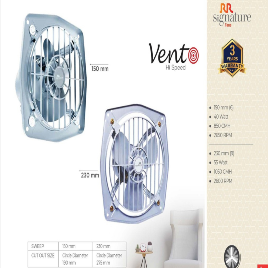 When you need a classic exhaust fan with assured performance, a really powerful motor and superb air thrust, Vento is an obvious choice. With specially designed aerodynamic blades, sturdy bird guard and premium finish, it is ideal for spaces like bathrooms, kitchens/ restaurants. With an RPM of 2650 RPM, Vento outshines its category. SWEEP 150 mm 230 mm CUT OUT SIZE Circle Diameter 190 mm Circle Diameter 275 mm Sweep(mm) Watt CMH RPM MRP 150(6) 40 850 2650 1690 230 (9) 55 1050 2600 1740